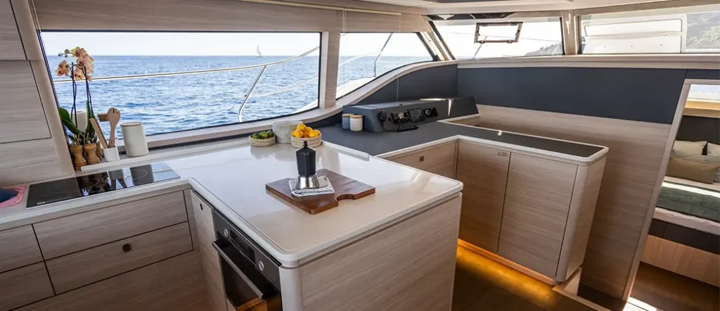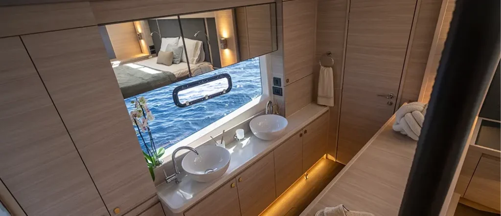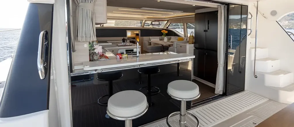 Aquila 46 de cinco cabinas, un baño, equipado con 2 motores intraborda Volvo Penta D6 de 480 HP, grúa eléctrica para dinghy con plataforma fija en popa, sistema de aire acondicionado de 50.000 BTU, completo pack de navegación Raymarine con piloto automático y radio VHF, además de foco con control remoto. Un catamarán robusto y listo para el charter, con flybridge, mesa y ducha en bañera, escalera de baño y cocina de inducción eléctrica. Entrega: Primavera 2026