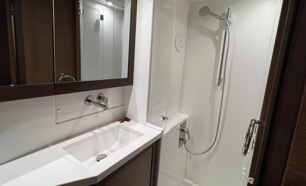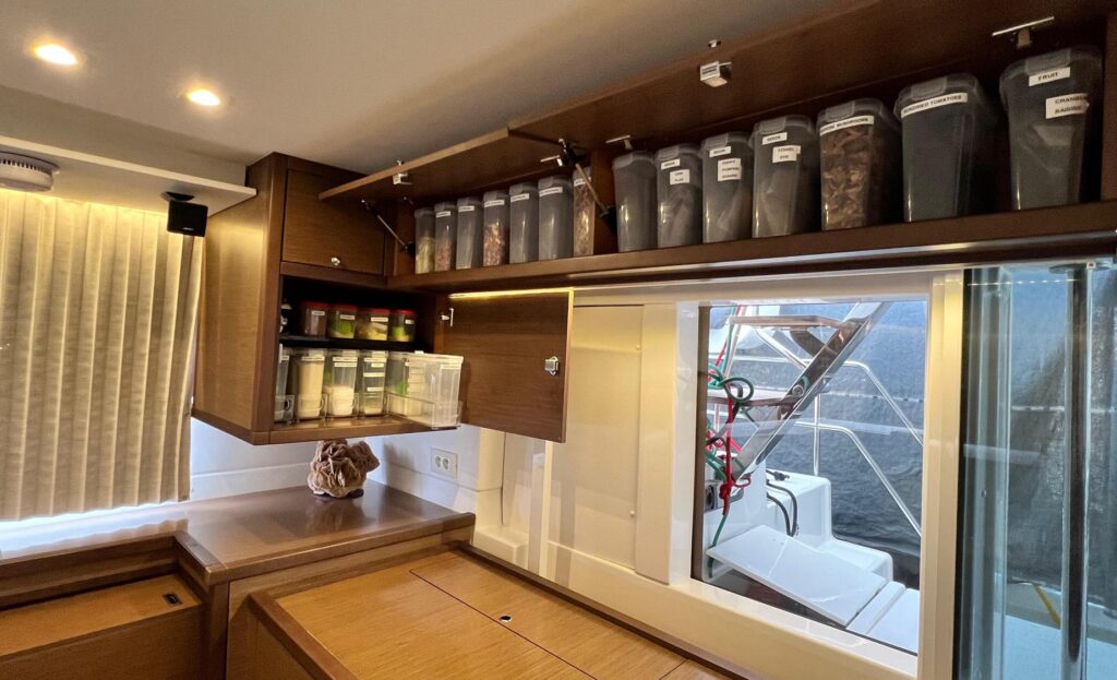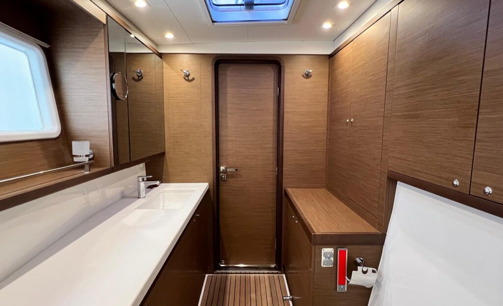 En cuanto a comodidad, ofrece un sistema de sonido Fusion con altavoces Bose y Sony Marine, TV LG con elevador eléctrico, cocina con refrigerador/congelador de acero inoxidable, horno y más.
